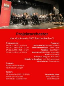 Projektorchester 2025 – Sei dabei! Der Musikverein 1957 Reichenbach e.V. lädt ein zum großen Projektorchester – und DU kannst dabei sein! Für Musiker:innen: Hast du Lust, Teil eines großen Orchesters zu werden? Dann spiel mit! Spannendes Programm von epischer Filmmusik bis „Coldplay in Symphony“ Proben: 14.11., 15.11., 22.11. & 28.11.2025 Maximilian-Kolbe-Haus, Reichenbach-Steegen Anmeldung: epp116@aol.com 01525-5630200 Für alle Musikliebhaber:innen: Am 29. November 2025 um 19:30 Uhr erwartet euch das Abschlusskonzert im „Emmerich-Smola-Saal“, SWR-Studio Kaiserslautern. Ein Abend voller Emotionen, Gänsehaut und mitreißender Musik! Ob auf der Bühne oder im Konzertsaal – sei Teil dieses besonderen Projekts!